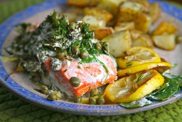 Salmon with Yogurt, Spinach, Lemon and Capers