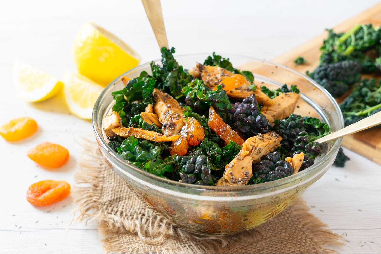 - Assemble the salad: Add the sliced chicken, dried apricots, seeds, and thyme to the bowl with the massaged kale.