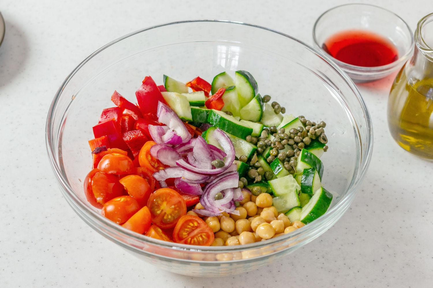 Once your vegetables are prepped, combine them with the chickpeas in a large bowl. This is where the salad begins to take shape, with colors and textures coming together beautifully.