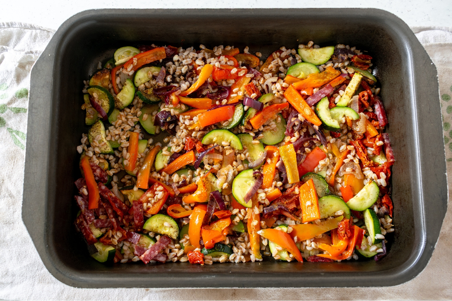 - Assemble the bake: Add the cooked farro, sun-dried tomatoes, pepperoni, smoked paprika, oregano, garlic, vegetable stock, and additional salt and pepper to taste directly into the roasting pan. Stir well to combine all ingredients.