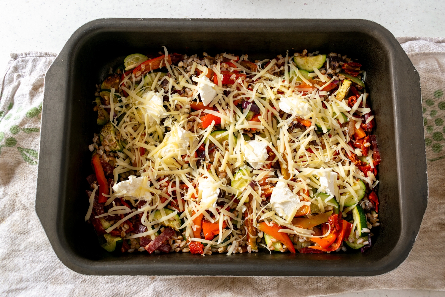 For this farro pizza bake, cooking the farro separately ensures it maintains its structure when baked with the vegetables and cheese.