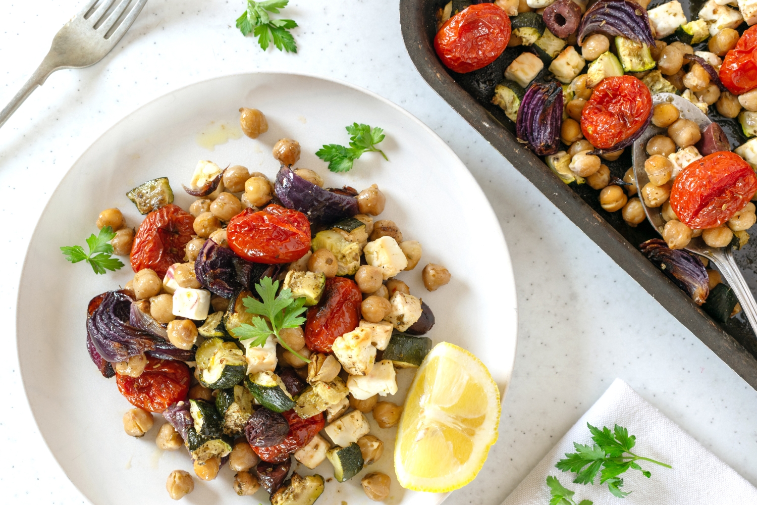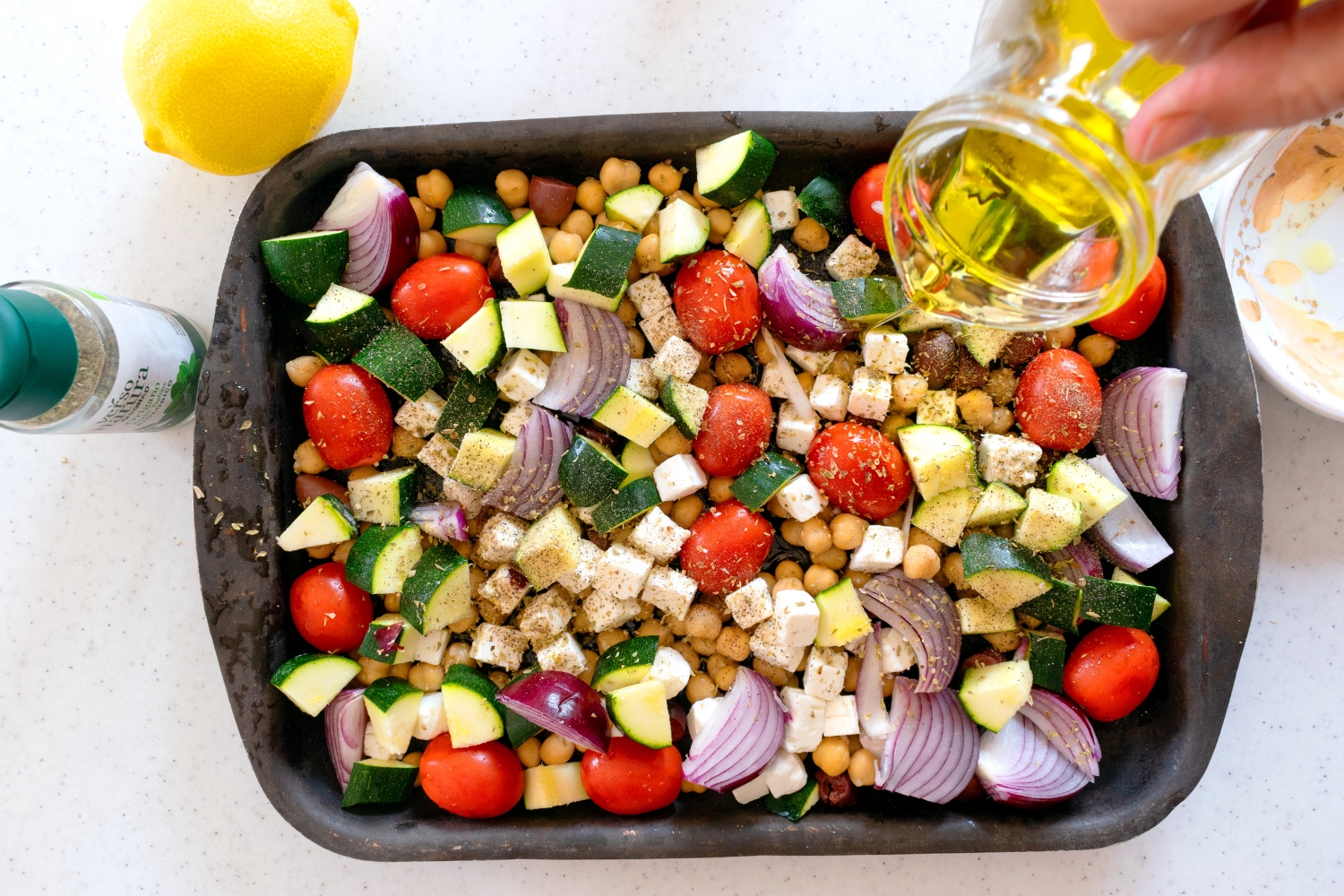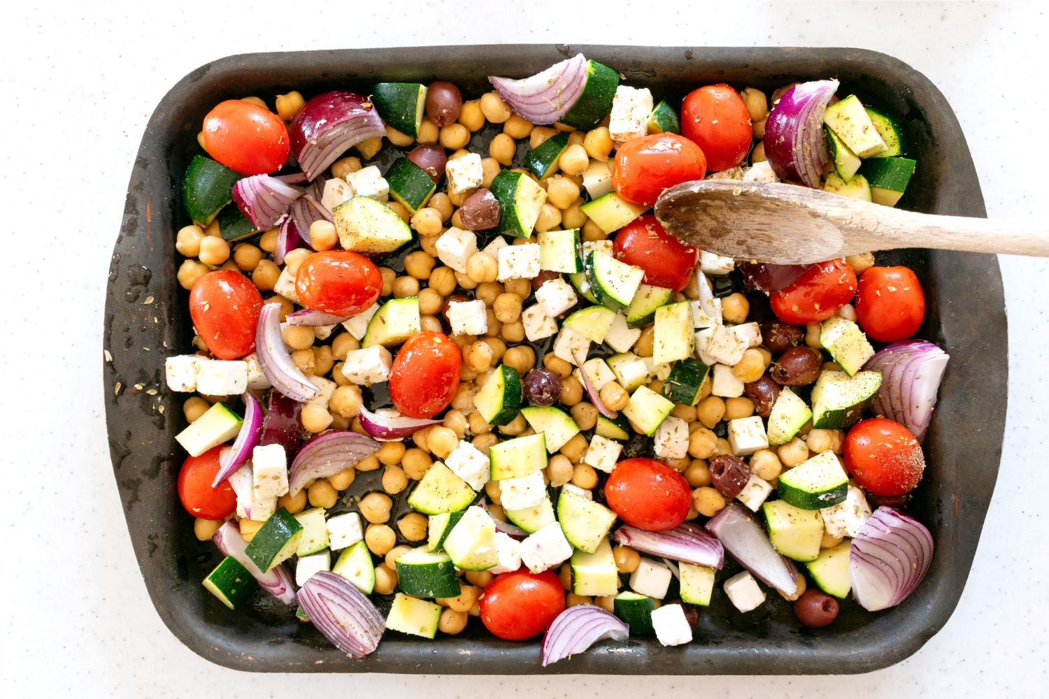 - On a large sheet pan, combine chickpeas, olives, cherry tomatoes, zucchini, feta, and red onions.
